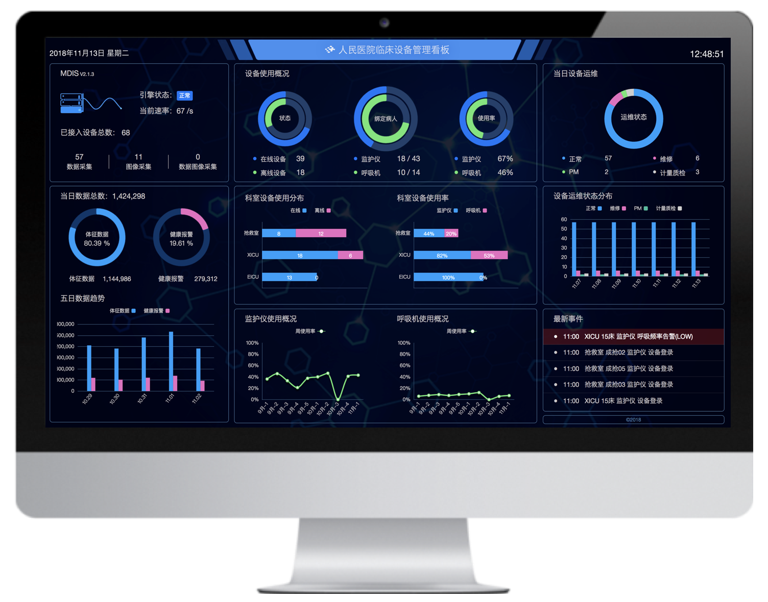 實時顯示數(shù)據(jù)引擎狀態(tài),數(shù)據(jù)趨勢、設備使用概況、科室品牌設分布和使用概況、設備運維狀態(tài)、最新運行事件的可視化數(shù)據(jù)大屏